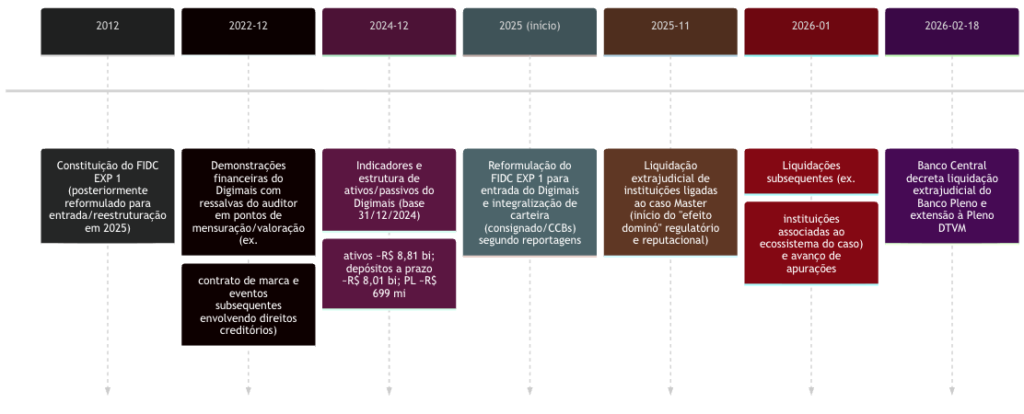 O núcleo do “efeito dominó” aqui analisado é a combinação de: cadeias de originação/cessão de crédito e de securitização envolvendo ativos associados a instituições que passaram por regimes especiais ligados ao caso Master; disputa judicial envolvendo o FIDC EXP 1 (com pedidos/alegações de recompra e questionamentos sobre lastro/validade documental de créditos); e um ambiente pós-crise com maior sensibilidade de depositantes/investidores a bancos médios/pequenos e estruturas opacas.